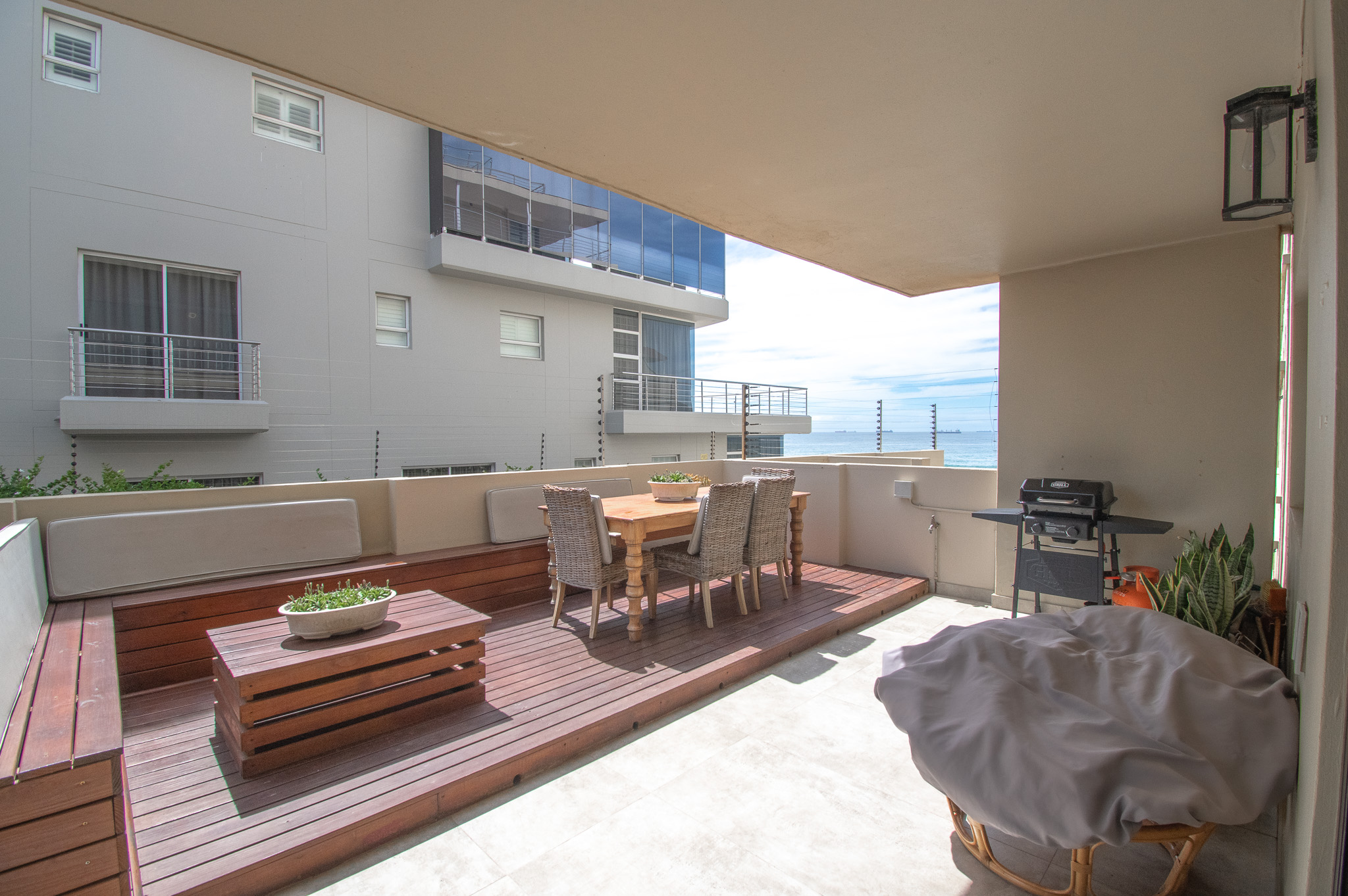 A fully equipped kitchen, including a washing machine. Large screen smart TV with free Wi-Fi throughout. The balcony has a gas braai, and a dining table for you to enjoy the ocean sounds and views. DSTV / Netflix etc., are not included, please bring your own codes.
